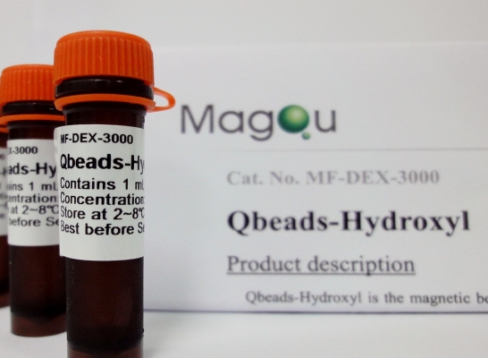 Qbeads-Hydroxyl is the magnetic bead with hydroxyl groups -OH. The magnetic beads consist of single-crystal Fe3O4 sphere core coated with dextran dispersed in PBS solution. The structure of dextran provides a lot of hydroxyl groups –OH and this hydrophilic surface ensures the magnetic beads excellent dispersion ability and easy handling property in a wide variety of buffers. The beads are available for you to achieve rapid and efficient biomagnetic separation and ensure reliable and reproducible results.