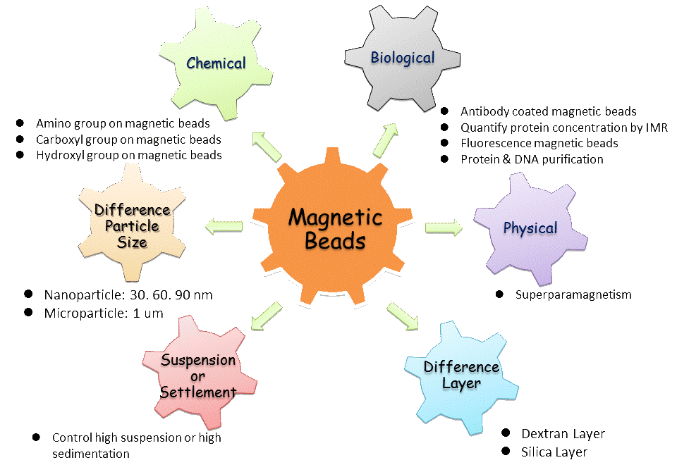 Through chemical modification of dextran, the magnetic beads are functionalized withamino group (-NH2), carboxyl groups (-COOH), or Hydroxyl group (-OH).