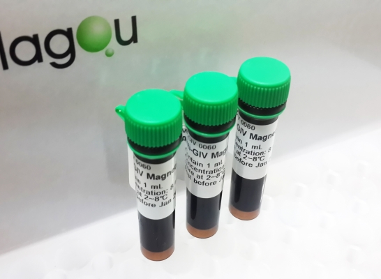 虹彩病毒(Iridovirus)可分類成五個屬,依不同屬的特性及環境的不同,從昆蟲到兩棲類及魚類皆是感染的目標。台灣石斑魚在養殖過程中,從孵化至吋苗時期易感染神經壞死病毒,而吋苗至成魚時期則是虹彩病毒感染的高峰期,受感染的魚隻會有體色變黑、脾、腎臟腫大、臟器組織內有肥大細胞、鰓部出血等症狀,輕則賣相不好影響價格,重則大量死亡,造成養殖戶經濟上的損失。虹彩病毒磁減量檢測試劑是利用磁性免疫方法進行虹彩病毒的快速定量檢測。在粒徑50 nm Fe3O4 磁性粒子表面結合抗體,當表面抗體與病毒結合後,會使磁性粒子產生叢集,進而改變是磁性粒子在外加交流磁場下所產生的交流磁訊號(χac)。藉由交流磁訊號的改變,可以快速精確的定量虹彩病毒。