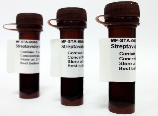 針對用來標記特定分子的生物探針(例如抗體),經常必須被接合在磁粒子表面的界面活性劑上(如本公司所推出之表面披覆有之葡聚糖的Fe3O4磁粒子)。為了使各種類型的生物探針,能與和磁粒子表面的界面活性劑(如葡聚糖)高效率地結合,本公司利用avidin (或其衍生物)和biotin之間的高親合力特性,作為各種生物探針與磁粒子表面界面活性劑結合的橋段。本公司選用的avidin衍生物是streptavidin。透過化學反應,使streptavidin共價鍵結在葡聚糖上,以使磁粒子可以與任何含biotin的生物探針(biotinyl-bio-probe)結合。實驗操作上,僅需將含biotin的生物探針與streptavidin磁性試劑混合後,生物探針可以容易地接於磁珠表面上。之後,再使用磁性分離來移除多餘的生物探針,即可獲得帶有所需生物探針的磁珠。