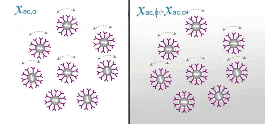 當上述的外加交流磁場頻率在幾十到幾百萬赫茲時,磁性試劑中的單顆磁性粒子會受到外加交流磁場的驅動,產生旋轉,磁性試劑因而產生交流磁訊號(χac)。而當磁性試劑與待測樣品混合後,樣品中的待測生物分子會透過磁性粒子表面上的生物探針(如抗體),與磁性粒子相結合。如此,將造成試劑中的部份磁性粒子體積變大,甚或造成多顆磁性粒子聚集在一起。在此情況下,磁性試劑中可受外加磁場驅動而旋轉的磁性粒子數目,與先前未與待測樣品混合時的旋轉磁性粒子數目相較,會少了許多。故,磁性試劑的交流磁訊號(χac)會因待測樣品中受檢生物分子與磁性粒子的結合,而被降低,此即我們稱此檢測方式為磁減量檢測的原因。並且,由上述中可知,當樣品中含有越多的待測生物分子時,將有越多的磁性粒子與待測生物分子相結合,因此將會表現出更大的磁減量。所以,透過磁性試劑的磁減量量測,我們可測得樣品中待測生物分子的含量。